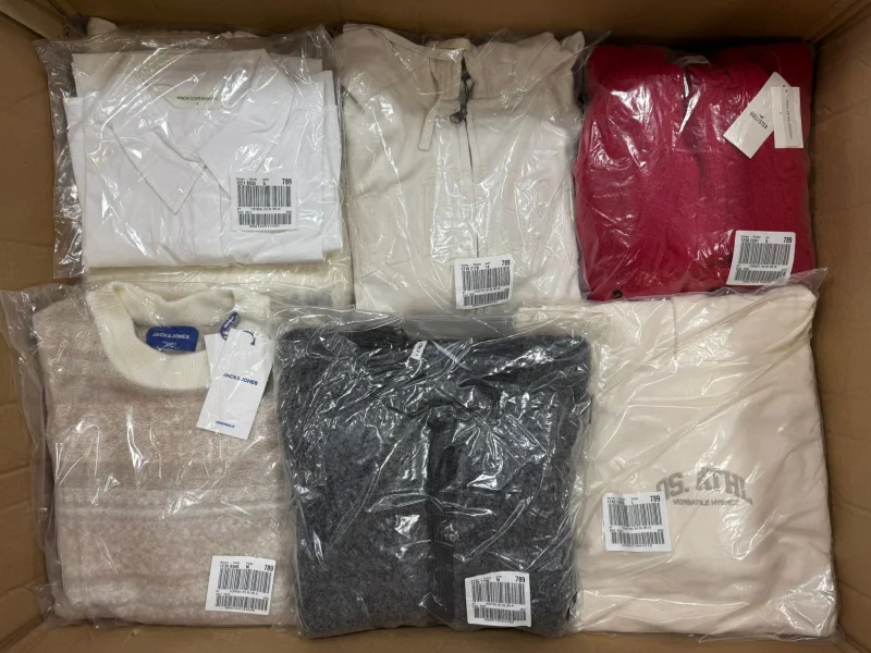 -> W pakietach znajdziecie odzież damską i męską, około 10% odzieży dziecięcej. Kurtki, płaszcze, swetry, bluzy, koszule, spodnie materiałowe i jeansowe, t-shirty
